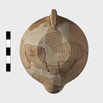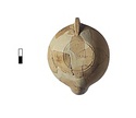 On discus, on top part, bearded figure in tunic, boots and small cap, facing right, holding shield before him. Filling hole on center right, between figure and shield; air slit near front edge. In the field around the figure, to the left, a corselet; to the right, a crested helmet and a pair of greaves.