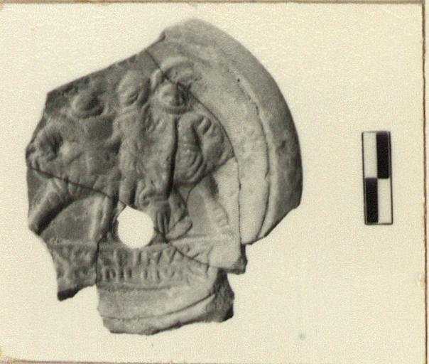 | Description: | Two non-joining fragments. Fragment a), preserving most of discus of lamp, showing two gladiators facing left and one facing right. Beneath them a latin inscription in two lines: "SABINVS POPILLIVS" Fragment b), part of (inscribed) base and wall . Cf. Corinth IV, ii, p. 82, no. 461. Loeschke (1919), Lampen aus Vindonissa, no.113, pl. XV. <graphic> ADDENDA: now joined. | |