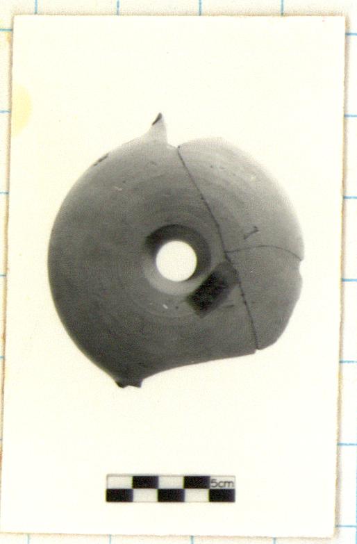 | Description: | Mended from four fragments. Tips of nozzles, parts of rim and wall missing. Convex bottom with central conical tube, flat rim projecting inside only, sloping down toward center, sharp angle at juncture of rim and wall. Two opposing nozzles (only partially preserved) rising above rim. Glazed: interior and top of rim, dull black and peeling. Buff clay, brittle. Imported (?). Type 19A of Agora collection. Cf. Agora IV, nos. 131, 132. Ca. 490-480 B.C. | |