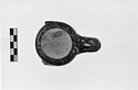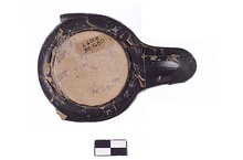 | Description: | Mended from many fragments; complete except for horizontal strap handle. Low disk foot, slightly concave and reserved underneath; vertical wall, broad, inward-sloping in rim; long nozzle. Good shiny black glaze. Orange-buff clay. Cf. Agora IV, no. 228, Type 23C. Early 4th. century B.C. | |