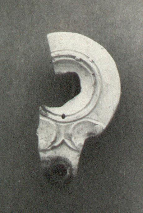 | Description: | Fragment from right side of lamp. Plain, flat rim, set off by two grooves from plain concave discus. Rather long nozzle; pointed, with volutes on rim and a small ridge between. No trace of handle at the back of the lamp. On bottom, deep circular groove, with the letter "K". No trace of glaze. Fine hard pinkish-buff clay. Related to type XXIII of Corinth collection. | |