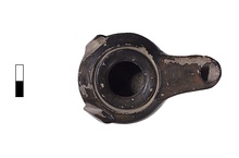 Black glaze, mottled reddish-brown and flaking, all over except for reserved underside and groove.