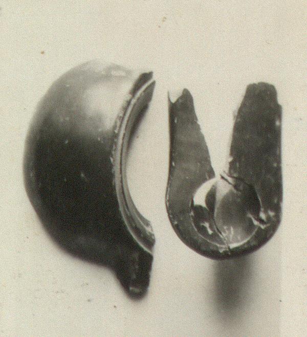 | Description: | Two fragments from very large lamp. One fragment preserves most of one side of body, with start of nozzle and handle. Narrow rim, sloping inwards, set off from nearly vertical-sided body by deep groove colored with miltos. The other fragment, mended from several pieces; preserves part of a very large nozzle, flat on top. They do not join, and the nozzle appears disproportionately large for the body, but the fabric and the heavy black glaze, somewhat silvered on both pieces, indicate that they belong together. Type VIIA of Corinth collection, type 26A of Agora collection. | |