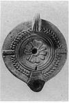 | Description: | Panelled rim, with narrow band of raised herringbone round inner edge. Ridged discus, with rosette round filling hole. Straight sided nozzle, slightly raised; double grooved pierced handle. Bottom plain, with circular groove. Unglazed. Fine buff clay. Type XXVII of Corinth collection. | |