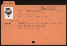 | Description: | Vertical strap handle broken away. Concave plain discus; solid ornamental lugs on sides. Traces of raised "A" on base. Thin brown glaze. Bright red clay. Type XXIV of Corinth collection. | |