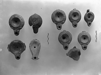 | Description: | Body of lamp mended from several fragments. Top and handle missing. Handle was vertical strap. Raised dots on body. On reverse "A". Type XX of Corinth collection. | |