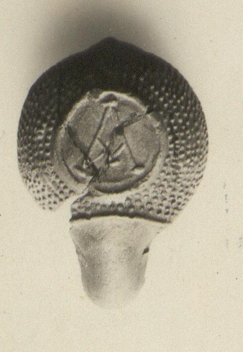 | Description: | Body of lamp mended from several fragments. Top and handle missing. Handle was vertical strap. Raised dots on body. On reverse "A". Type XX of Corinth collection. | |