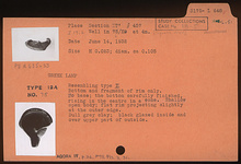 | Description: | Bottom and fragment of rim only. No base; the bottom carefully finished, rising in the center in a cone. Shallow open body; flat rim projecting slightly at the outer edge. Black glazed inside and over part of outside. Dull gray clay. Resembling type II of Corinth collection, type 12A of Agora collection. | |