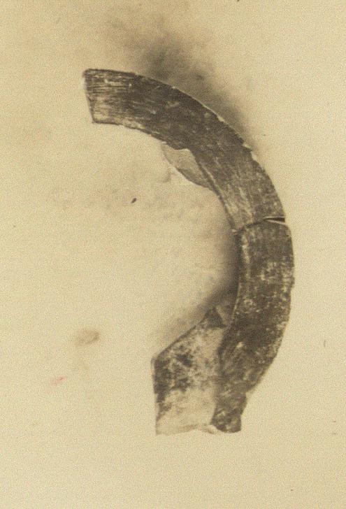 | Description: | Right side preserved. Narrow down sloping rim; bottom rising toward center. Dull black glaze on rim, and bottom inside. Outside, the upper part of the body unglazed, the lower part polished (?). Dull buff clay, possibly Corinthian. Type III (plain variety) of Corinth collection, type 19A of Agora collection. ADDENDA The transparent glaze used on the outside of lamps of type II of Corinth collection. | |