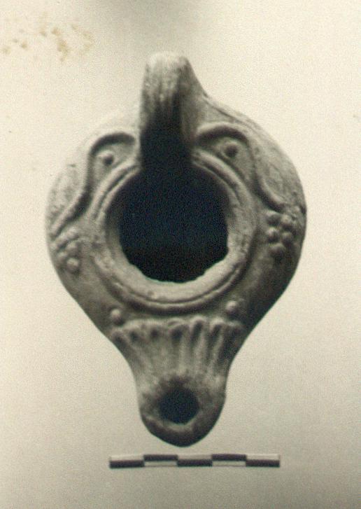| Description: | Discus missing, surrounded by a raised ridged band. Watch-shaped body; on the down sloping rim, a cluster of grapes on either side. On the throat, rays, centered on the wick hole. High solid handle, double grooved above. On the reverse, within a raised band, an impressed foot; the base ring is connected with the back of the handle by shallow grooves. Remains of purplish-black glaze. Buff clay. Related to type XXIX of Corinth collection. | |