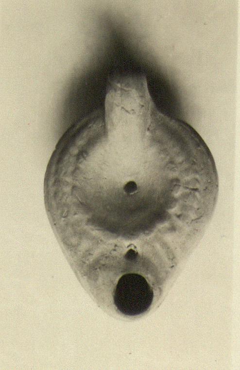 | Description: | On rim, herringbone. On discus, rosette, only the outer tips of the petals appearing. Both patterns faint, as if from much worn mould. Handle, double grooved above and below. On the reverse, a single circular groove. Dull pinkish-brown clay. Type XXVIII of Corinth collection. Cf. L 752. | |