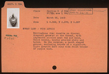 | Description: | On rim, herringbone. On discus, rosette; diagonal grooves at the throat, with impressed circles next the air hole. Solid handle, double grooved above and below. On the reverse, a heart-shaped groove, enclosing traces of a signature. Faint traces of purple wash. Light grayish-buff clay. Type XXVIII of Corinth collection. | |