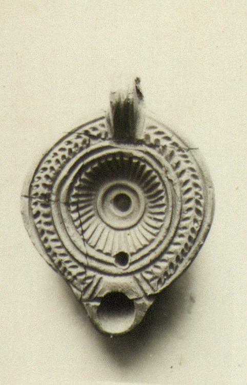 | Description: | Mended from several fragments; most of the reverse missing. On rim, herringbone. Rays on sharply concave discus; both patterns unusually clear and neat. Solid handle, triple grooved above and below, with a debased heart-shaped pattern at the bottom. On the reverse, remains of two concentric grooves setting off a low base ring. Remains of purplish-brown wash. Yellow-buff clay. Type XXVIII of Corinth collection. | |