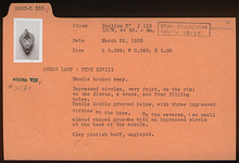 | Description: | Handle broken away. On rim, impressed circles, very faint. On discus, a cross, and four filling holes. Handle, double grooved below, with three impressed circles at the base. On the reverse, two small almond-shaped grooves, with an impressed circle at the base of the nozzle. Unglazed. Pinkish-buff clay. Type XXVIII of Corinth collection. | |