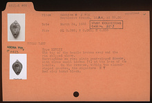 | Description: | The top of the handle broken away and the rim chipped above. On rim, herringbone. Plain, pear-shaped discus, with three small leaves (?) at the base of the handle. On the reverse, within two almond-shaped grooves, the signature: "K Y". Red clay, burnt black. Type XXVIII of Corinth collection. | |