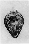 | Description: | The top of the handle broken away and the rim chipped above. On rim, herringbone. Plain, pear-shaped discus, with three small leaves (?) at the base of the handle. On the reverse, within two almond-shaped grooves, the signature: "K Y". Red clay, burnt black. Type XXVIII of Corinth collection. | |