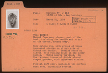 On the reverse, traces of double almond-shaped grooves, with impressed circles.
