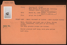 | Description: | Small fragment of discus. Eros playing flutes; head, shoulder and right arm of Eros, facing right, preserved, with part of his double flutes. Two deep grooves around the discus. Pale yellow-buff slip. Coarse pinkish-buff clay. Type XXVII (?) of Corinth collection. | |