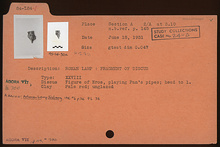 | Description: | Fragment of discus. On discus, a figure of Eros, playing Pan's pipes. Unglazed. Pale red clay. Type XXVIII of Corinth collection. | |