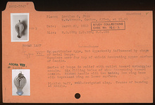 | Description: | Complete save for top of shield decorating upper surface of handle. Series of loops in relief with outlet toward triangular nozzle. Six filling holes of size decreasing toward nozzle. Ribbed handle with two holes, low ring base with impressed ring on lower surface. Traces of burning at nozzle. Pinkish-buff clay, well-levigated. Type XXI of Corinth collection. ADDENDA No particular type, but apparently influenced by shape of metal lamps. | |