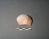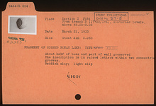 | Description: | About half of base and part of wall preserved. The inscription is in raised letters within two concentric grooves. Light slip. Reddish clay. Type XXVII of Corinth collection. <graphic> | |