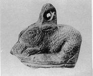 | Description: | Lamp in shape of hare. The base and part of the right side of the animal missing. No indication of the nozzle. The hare is crouching and nibbling at something held between his front paws. That the object is a lamp is indicated by the perforated suspension handle above the animal's ears, by the beginning of the filling hole in front of him, between his paws, and by the glaze on the inner surface of the filling hole. Red slip outside and also inside near the filling hole. ADDENDA Another example of the same type of object: cf. T 424. | |