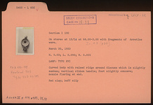 | Description: | Curved body with raised ridge around discus which is slightly sunken. Vertical ribbon handle. Foot slightly concave. Nozzle flaring at end. Buff slip. Red clay. Type XVI of Corinth collection, type 35D of Agora collection. 1st. century A.D. | |