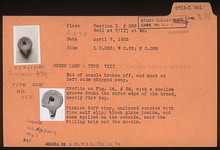 | Description: | End of nozzle broken off, and knob at left side chipped away. A shallow groove round the outer edge of the broad, nearly flat top. Unglazed outside with fine self slip; black glaze inside, and some spilled on the outside, near the filling hole and the nozzle. Type VIII (conventional variety) of Corinth collection, type 25D' of Agora collection. ADDENDA For profile cf. Corinth IV, ii, p. 32, fig. 14, profile 36. | |
