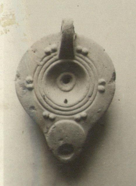 | Description: | Small deep filling hole framed by raised ring. Three raised rings edge the plain discus. On the rim, six pairs of pellets. Pierced handle triangular nozzle. Unglazed. Traces of burning at nozzle. Buff clay. Type XXVII of Corinth collection. | |