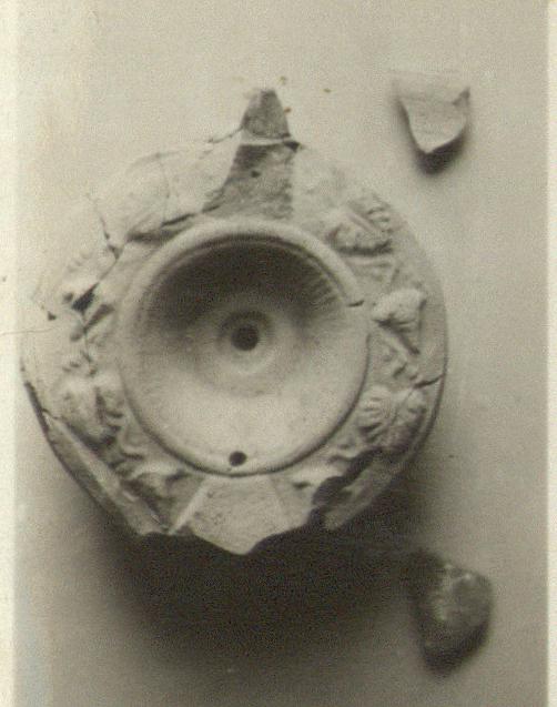 | Description: | Put together of several fragments; the greater part of the lamp can be restored, with the exception of the handle and the nozzle. Sunken discus decorated with narrow rays, with raised rings edging the filling hole and the outer side of the discus; a pattern of alternating grapes and vine leaves on the rim. Grooved handle. On bottom, incised ring and signature in relief. Unglazed. Careless work. Buff clay. Type XXVII of Corinth collection. <graphic> | |