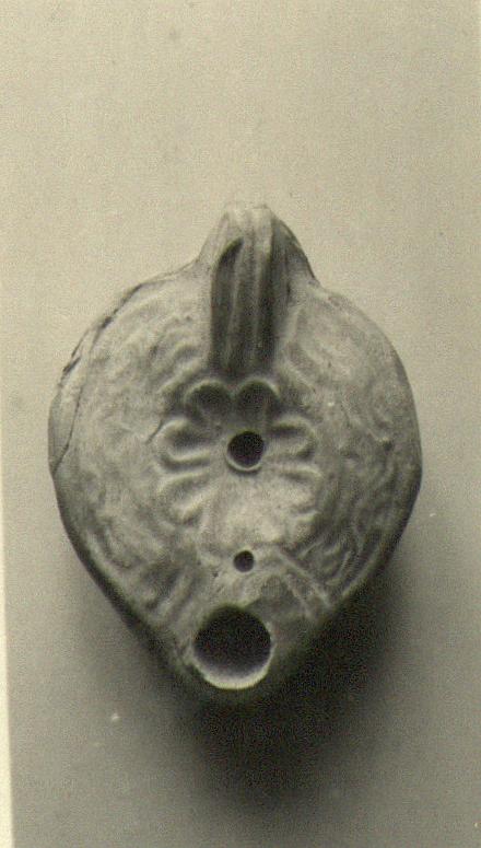 | Description: | Lower half at front missing; mended from two pieces. On rim, wavy lines. On discus, rosette. Solid handle, double grooved above and below; two large impressed circles at the bottom. On the reverse, double almond-shaped groove, with traces of a signature (?). Pinkish-buff clay, but fired or burned gray on top. Type XXVIII of Corinth collection. | |