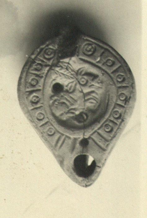 | Description: | Handle broken off; mended from several pieces; part of bottom and lower side of nozzle missing. Convex sides; a set of panels enclosing concentric circles on rim. On discus, animal (hare?) running right. Traces of grooves on the lower part of the handle. On reverse, within enclosing line, circles and the rest broken away. Unglazed. Buff clay. Type XXVIII of Corinth collection. | |