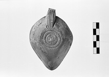 | Description: | Convex sides. On rim, wavy lines. On discus, rosette. Solid handle, with triple groove above and below. On reverse, within double bounding line, a palm branch. Thin red wash. Red clay. Type XXVIII of Corinth collection. | |