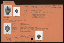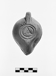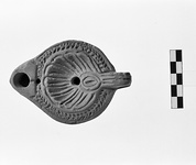 | Description: | On rim, herringbone. On discus, shell pattern. Handle, solid, triple grooved. Nozzle without stamped circles. On bottom, double concentric grooves, signed "A". Red glaze. Red clay. Type XXVIII of Corinth collection. ADDENDA For nozzle cf. Corinth IV, ii, p. 105. fig. 49, no. 7. | |