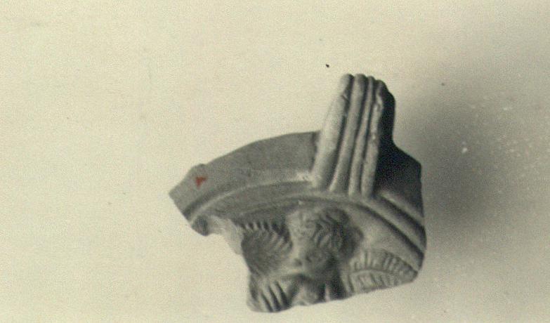 | Description: | Fragment of discus. Plain rim, with two grooves setting off the discus. On discus, the head and shoulders of Eros, with outspread wings, looking back over his right shoulder. Solid handle, triple grooved above and below. Red clay and wash. Type XXVIII of Corinth collection. | |