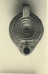 | Description: | Complete. On rim, herringbone. On discus, concentric grooves. A narrow hatched band sets of the rim from the nozzle; on the nozzle, two small circles. On the the top of the handle, a similar hatched band, double, on the upper part; below, two grooves. On the reverse, three concentric circles; in the center: "A". Rather dark red wash. Red clay. Type XXVIII of Corinth collection. Cf. Corinth IV, ii, no. 1372, pl. XXXIII. | |