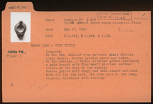 | Description: | Complete. On rim, debased vine pattern. Plain discus. Handle solid, double grooved above and below. On the reverse, a single circular groove enclosing a palm branch with four small circles; another circle at the base of the nozzle. Red wash almost entirely worn off the top part; the back part of the lamp, beneath, blackened with burning. Coarse yellow-buff clay. Type XXVIII of Corinth collection. | |