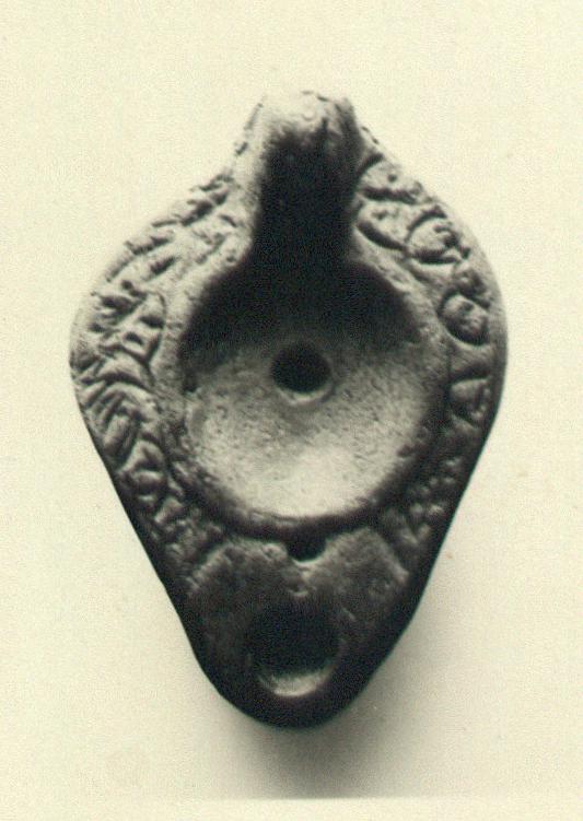 | Description: | Complete. On rim, debased vine pattern. Plain discus. Handle solid, double grooved above and below. On the reverse, a single circular groove enclosing a palm branch with four small circles; another circle at the base of the nozzle. Red wash almost entirely worn off the top part; the back part of the lamp, beneath, blackened with burning. Coarse yellow-buff clay. Type XXVIII of Corinth collection. | |