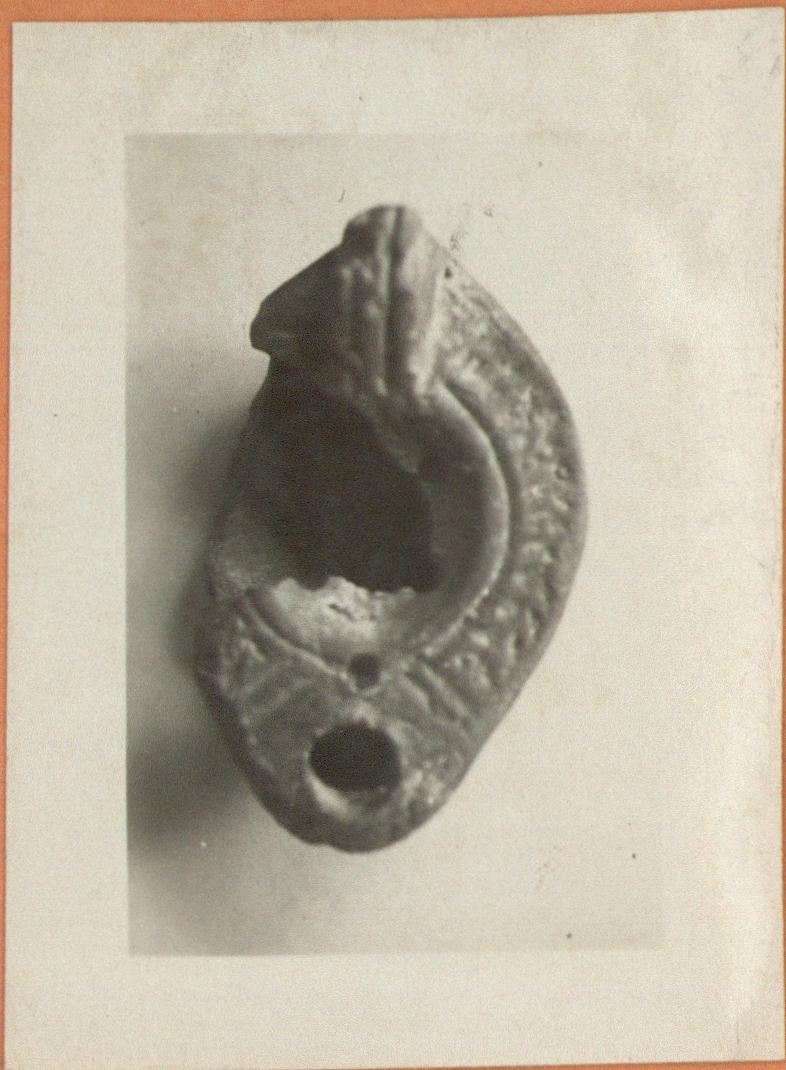 | Description: | Discus broken; plain with scattered air holes. On rim, herringbone. Handle solid, grooved. On bottom, almond-shaped double groove with seven stamped circles. Unglazed. Red clay. Type XXVIII of Corinth collection. ADDENDA For nozzle cf. Corinth IV, ii, p. 105, fig. 49, no. 4. | |