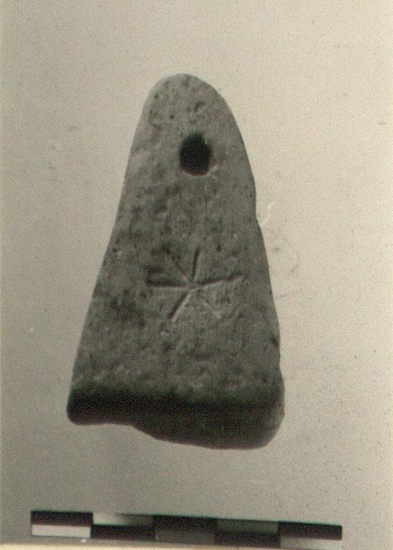 | Description: | Truncated pyramid. Pierced. One side has punched star rosette. Pinkish clay. | |