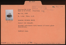 | Description: | Intact but chipped. Conical. Rounded underneath with traces of brown glaze decoration. Reddish clay. | |