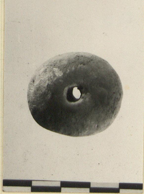 | Description: | Double cone, very roughly made. Light buff clay, burnt gray (?). | |