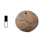 Description:   About two thirds preserved, with one of suspension holes. Restored in plaster.