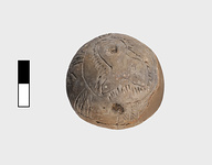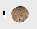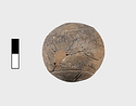 | Description: | Small piece missing, restored. Handmade incised ware. Pair of opposite suspension holes on top. Circle top and bottom; on top, trilobite line, edges with strokes; bottom, radii. Belly, zigzag and strokes. Pinkish-buff clay. Finish lost entirely. Early Geometric. | |