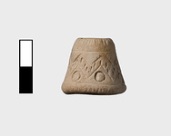| Description: | Intact, except for one chip. Handmade incised ware. Flat top and bottom, edges rounded. Strokes on top and bottom edges. On sides, zone enclosed by straight line; enclosed stroke zigzag, in each of lower angles (except one) an impressed circle. Pinkish-buff clay, lightly smoked. Polish lost. Early Geometric. | |