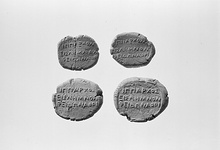 | Description: | Small chips missing from edges. Mended from two pieces. Obverse: inscribed. It has three lines of text made of an ovoid seal. Reverse: plain. Pink clay. Similar to MC 1174 and from seal 2-type II A. Cf. MC 1174, for the inscription. <graphic> | |