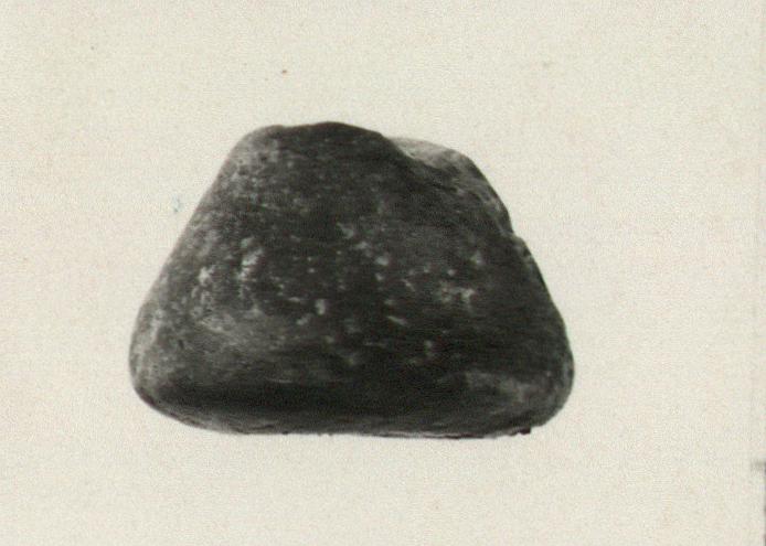 | Description: | Complete except for small chips. Worn around hole. Round conical, pierced through center. Gray clay, blackened and slightly cracked by fire. | |