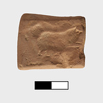 On one side very fine impression of a spitz dog with small head, heavy coat, curly tail. He is running with his front legs stretched forward. On other side a graffito.