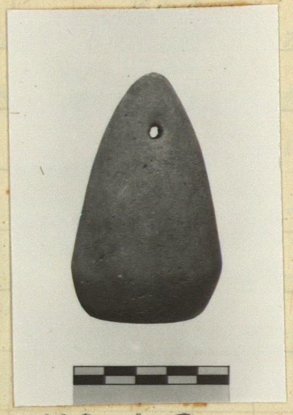 | Description: | Intact. Biconical. Pierced horizontally at top. Two holes pierced in bottom. Reddish clay with white grit. | |
