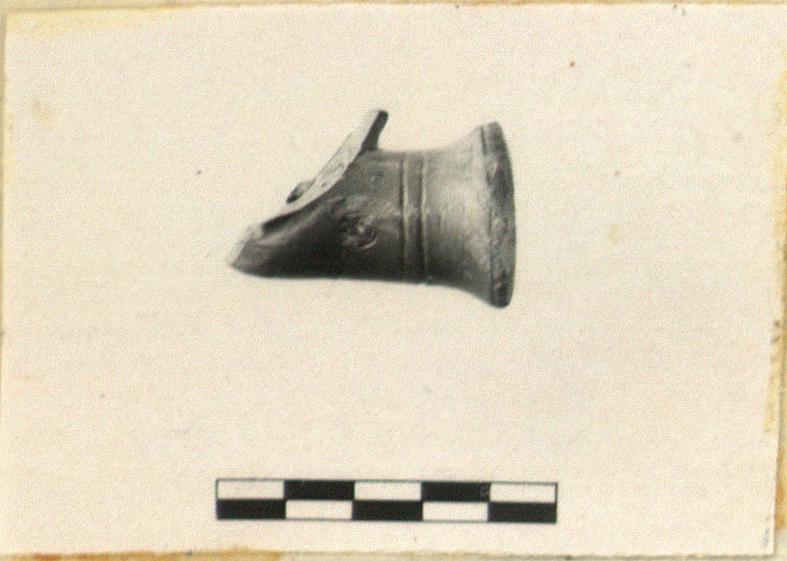 | Description: | Plain flaring stem socket. Grooves around it are the only decoration. Seal on left side. Orange clay, red slip. | |
